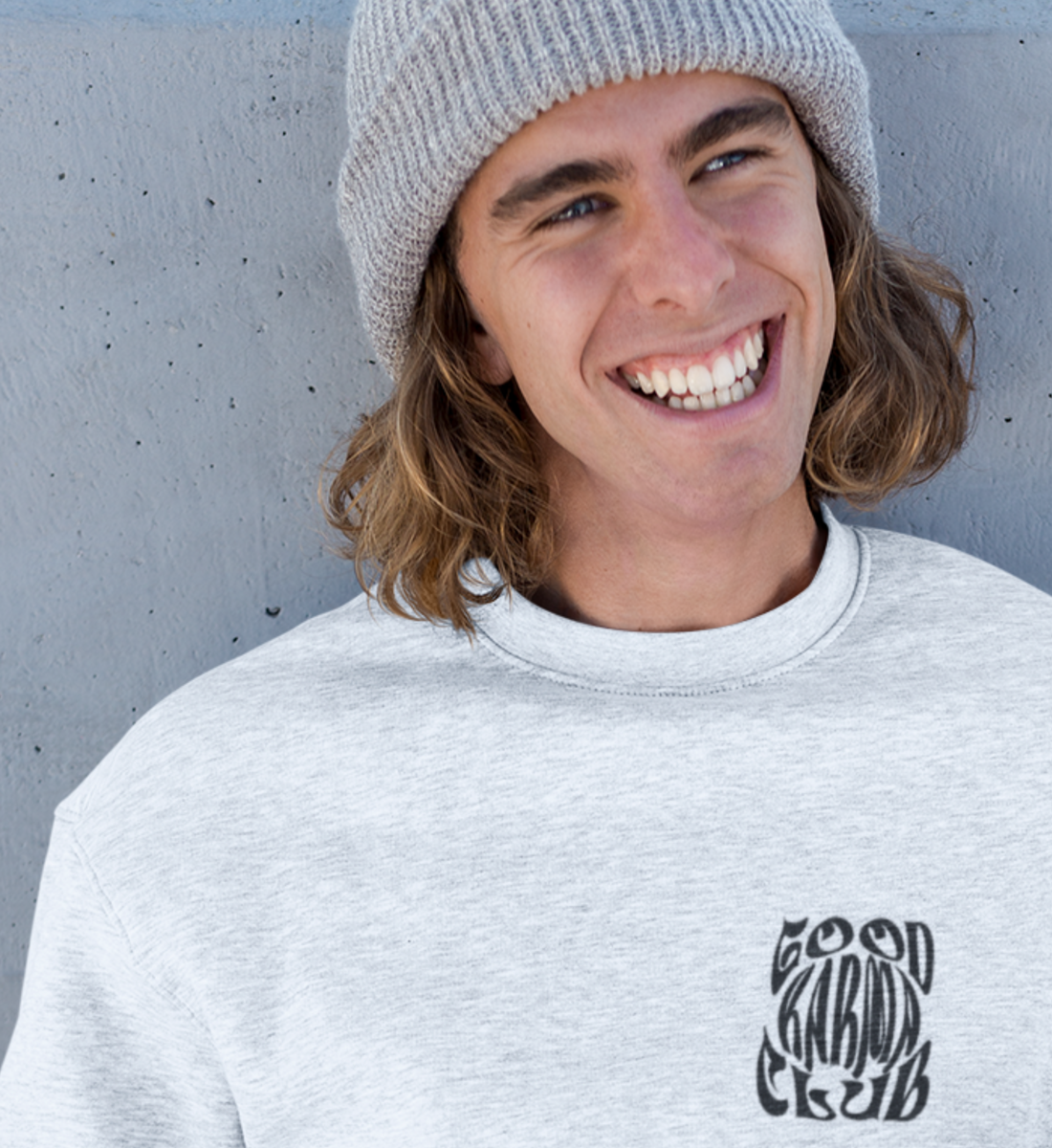 Werde Mitglied im "GOOD KARMA CLUB" mit diesem beidseitig bedrucktem Sweatshirt (hellgrau) in Bio-Qualität.